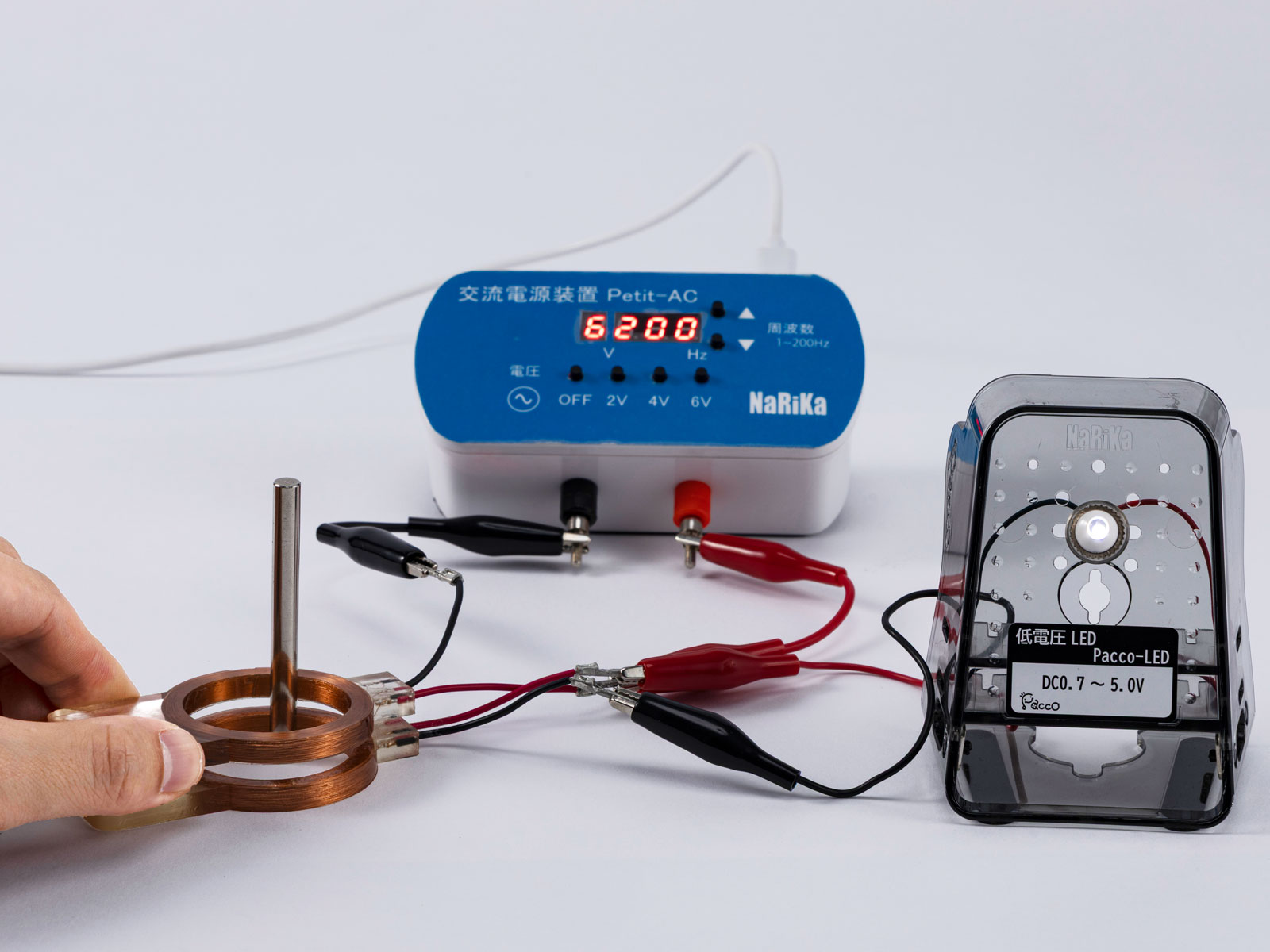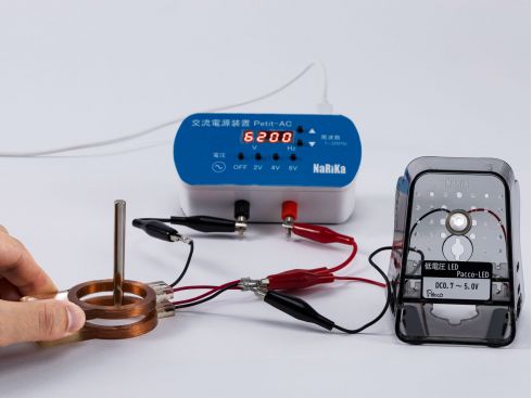 電磁誘導方式の無接点給電実験セット。送電コイルに交流電源を流すことで、周囲に周期的に変化する磁界を発生させます。この磁界内に受電コイルを近付けると、電磁誘導により誘導電流が発生します。受電コイルに付属のLEDを接続すると、誘導電流の発生をLEDの点灯で確認できます。