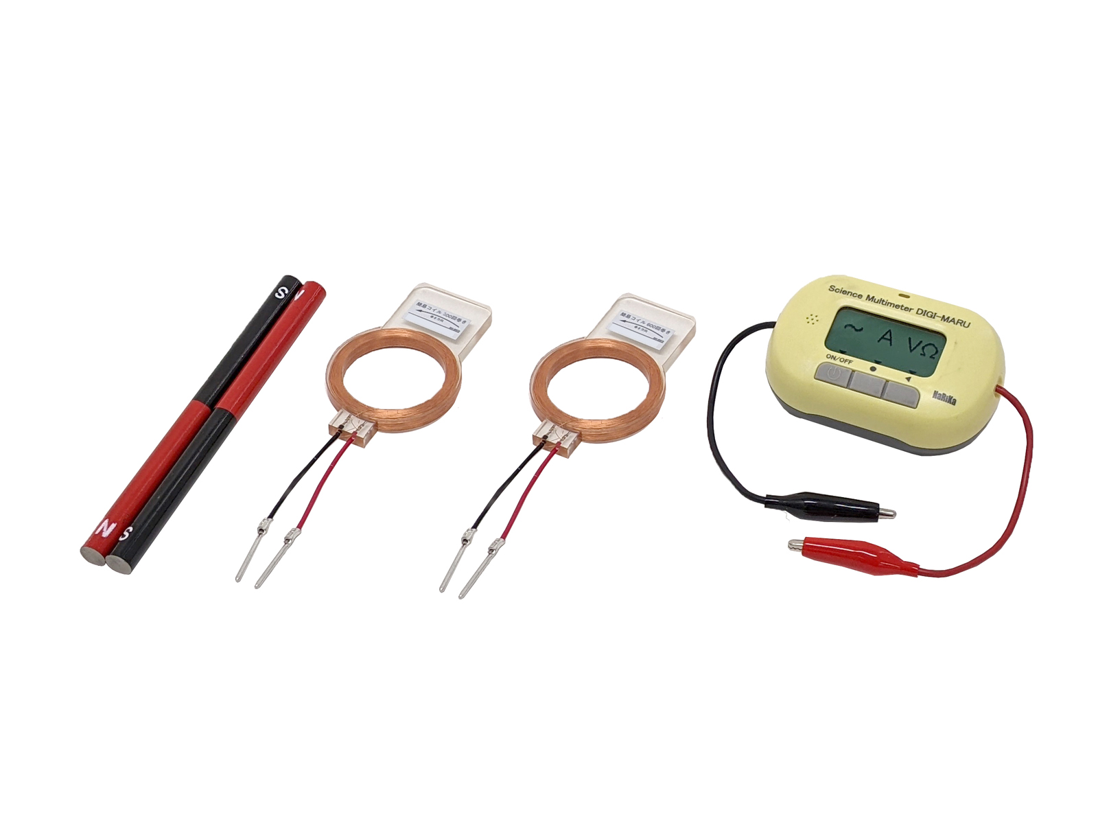 コイルに磁石を近付けたり遠ざけたりする実験で発生する電圧(誘導起電力)の波形を、サイエンスマルチメーターを使って確認できます。巻き数の異なるコイルを使用することにより、巻き数が変わると電圧にどのような違いが起こるか、またその比などを実験で確認できます。