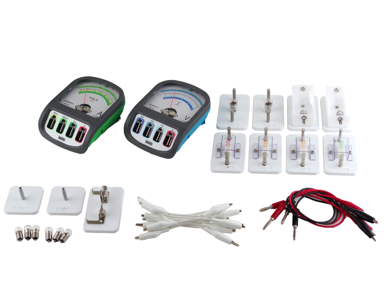 電気回路実験器KN-02(中学校用セット)と直流電流計HM-DA・直流電圧計HM-DVのセットです。収納に便利なケース付き。