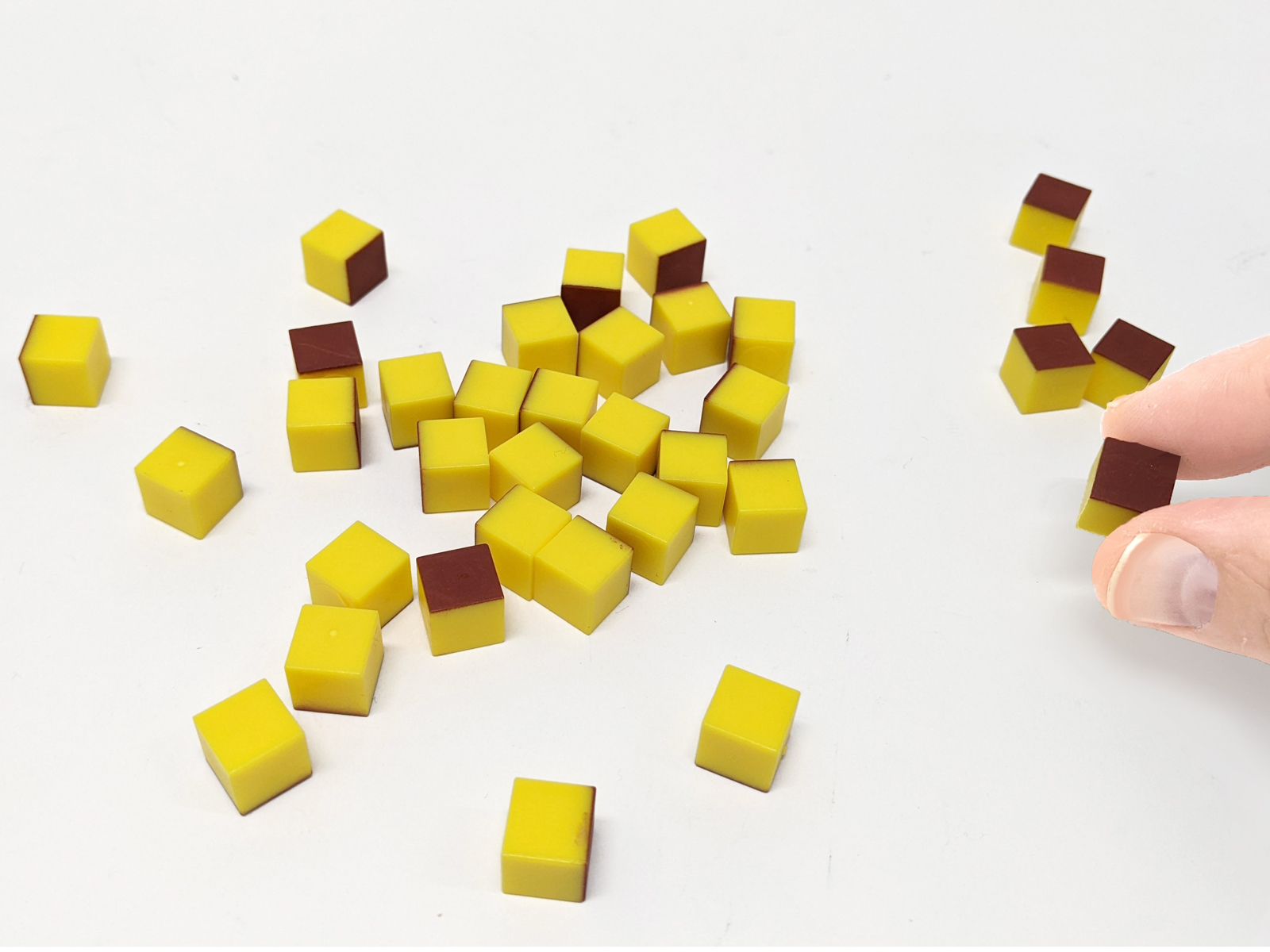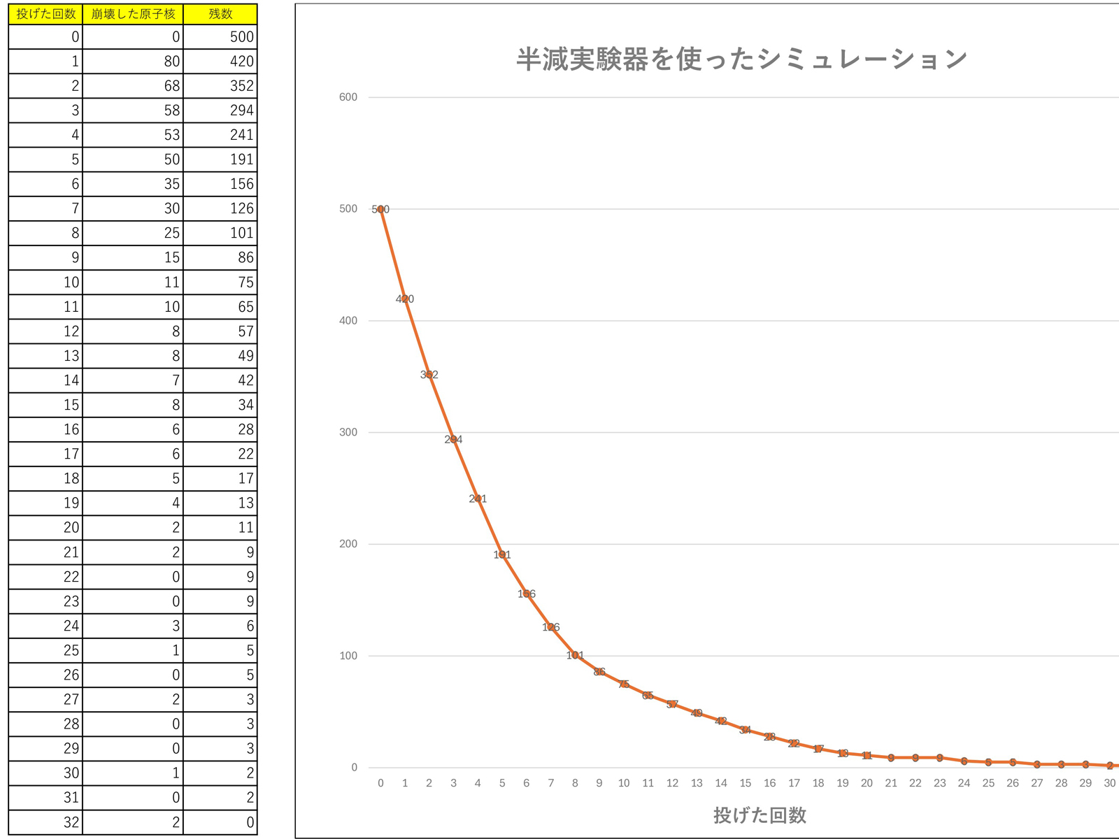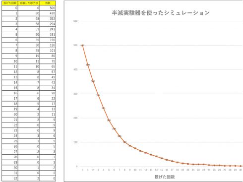 放射性物質の量が崩壊によって半分になるまでの時間「半減期」を実験から確かめることができます。原子核に見立てたキューブを投げ、濃い色の面が出たキューブを原子核が崩壊したものとして取除いていきます。投げるキューブがなくなるまでこの手順を繰り返し、その結果をグラフ化することで減衰曲線が得られます。また、100個ずつなどグループに配布して、それぞれの結果を持ち寄って減衰曲線を得る活動もできます。
