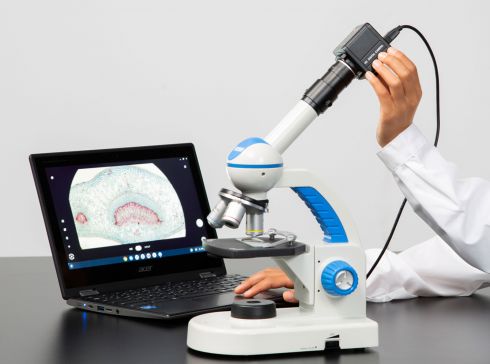 お手持ちの端末(Windows、Chromebook、iPad※1)のUSBポートに差し込み、端末内のカメラアプリ※2を利用してすぐに使えるUSBカメラです。顕微鏡接眼レンズアダプタ採用により、顕微鏡の接眼レンズに直接差し込み、撮影することができます。
