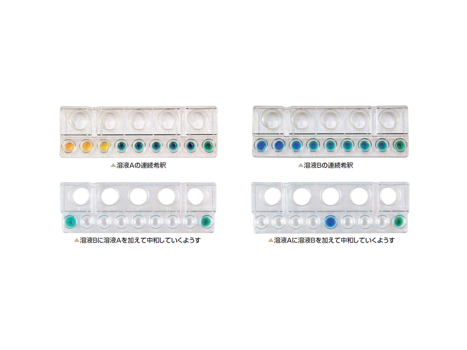 9つのくぼみがあるトレイ(SEPUPトレイ)と滴びん(プチボトル)を使用した、酸と塩基の中和反応や連続希釈によるpHや濃度変化の実験などを簡単に実験することができるセットです。調製済の酸や塩基、指示薬は滴びんに入っているので、準備に手間がかかりません。滴びんにプチボトルを使用することで、1滴あたりの精度が高く、中和滴定の定量実験が可能です。