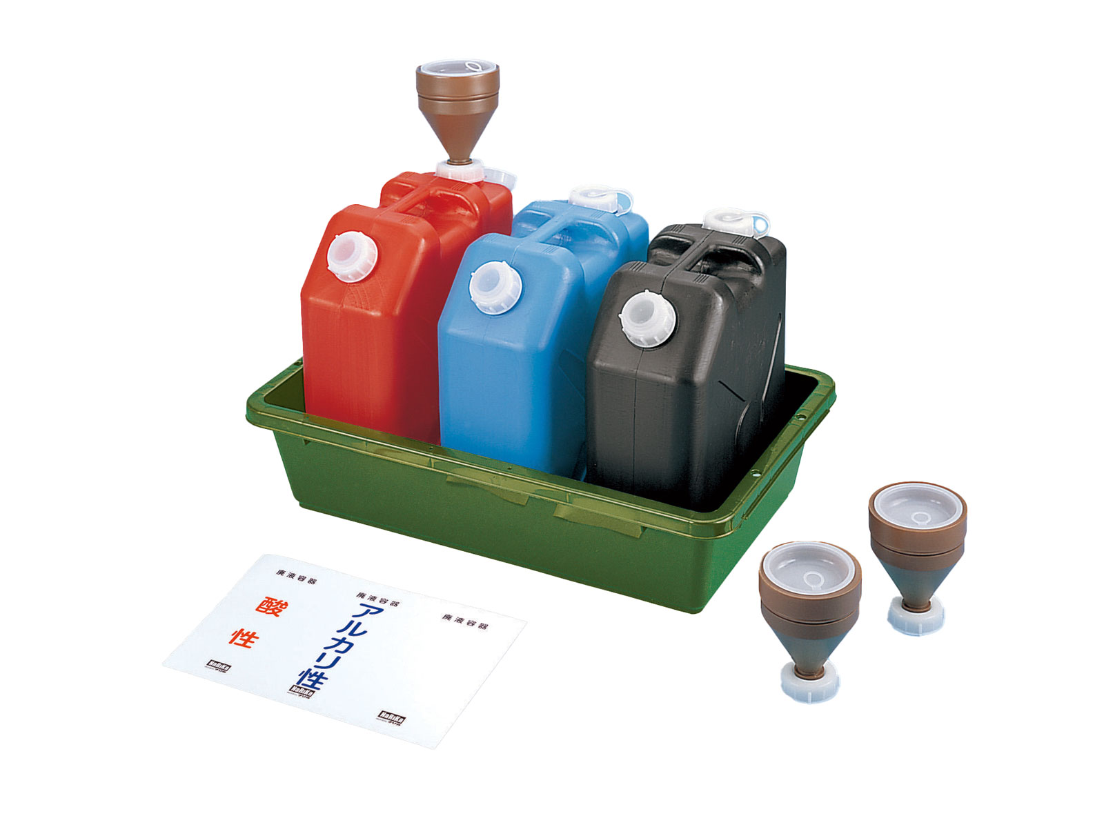 廃液貯蔵用のポリタンクです。大型キャップロートが付いているので、廃液を入れる際にこぼれにくく大変便利です。それぞれに「酸性」「アルカリ性」「無地」の分類シールとトランクトレーが付いており、廃液の管理に最適です。