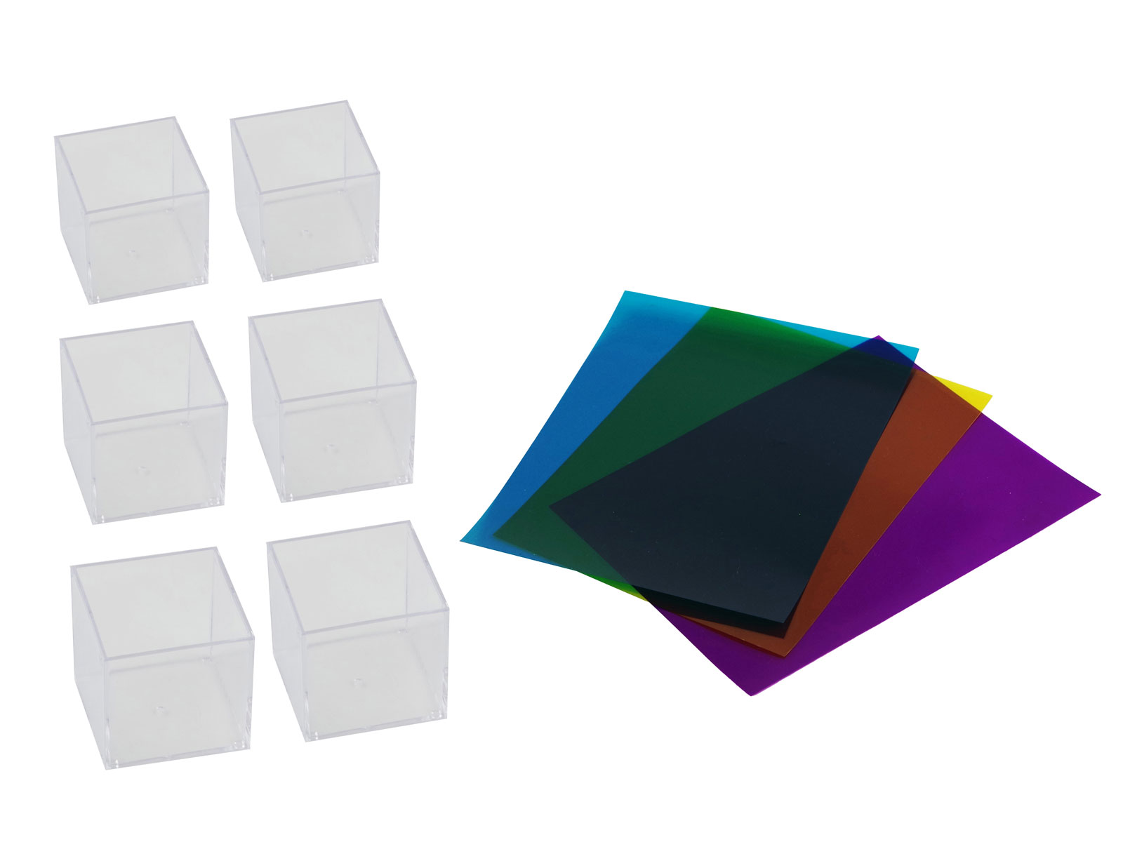 立方体の中に水をそそぐと光の屈折によって中央に小さな立方体が現れます。それぞれのフィルターのどの部分が屈折して小さな立方体の側面を作っているのか考えてみましょう。