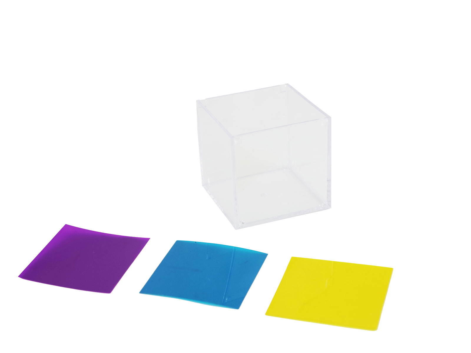 透明な立方体にシアンフィルタ、マゼンタフィルタ、イエローフィルタを内側に貼付けて観察します。