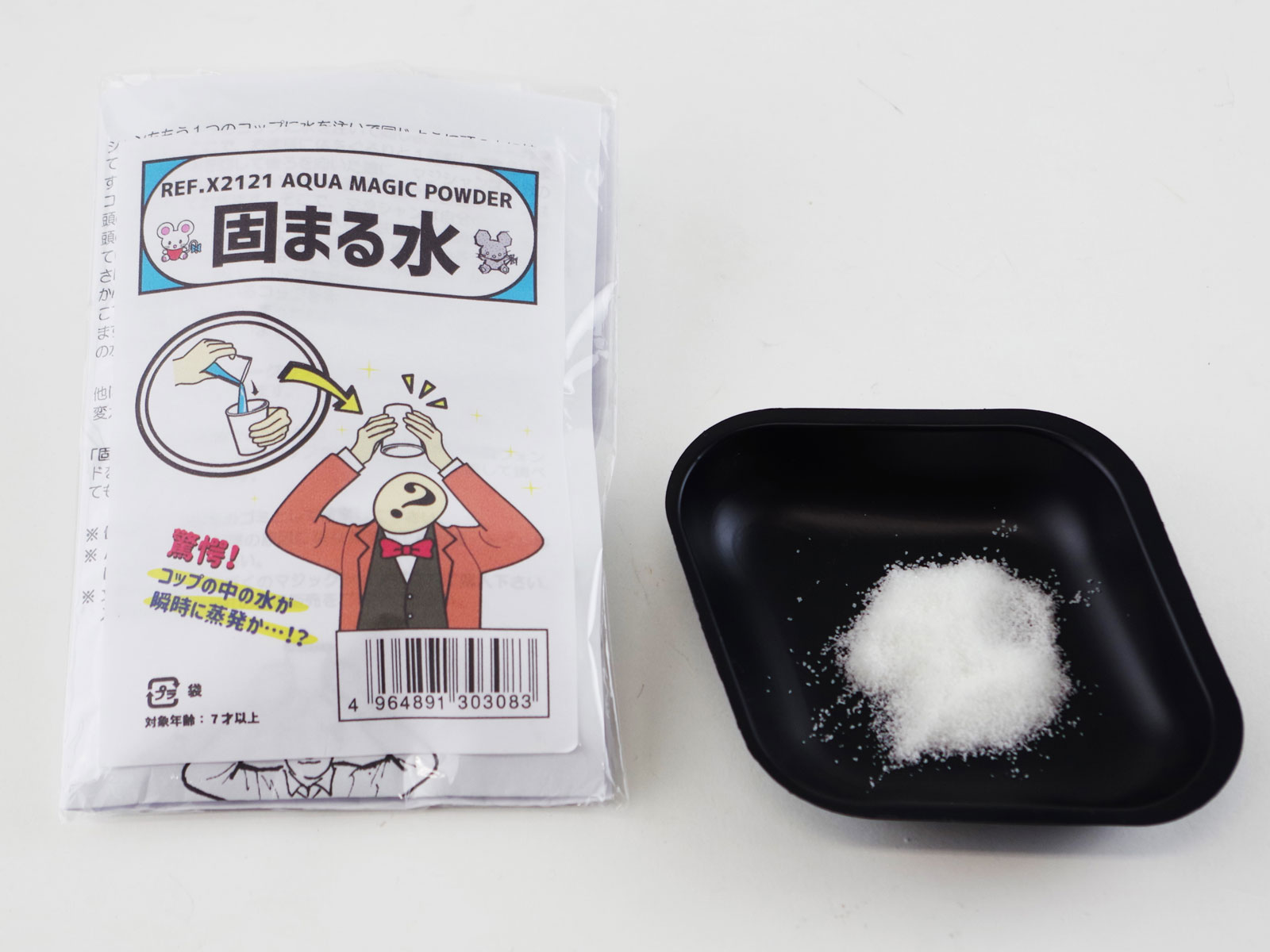本製品(高吸水性ポリマー)を使って、「逆さコップ」のマジックに挑戦してみましょう。水を瞬時に固体に変える驚きの現象を通して、高吸水性ポリマーの持つ吸水・ゲル化の性質を楽しく学ぶことができます。手品という遊びの要素を取り入れながら、科学の不思議に触れてみましょう。